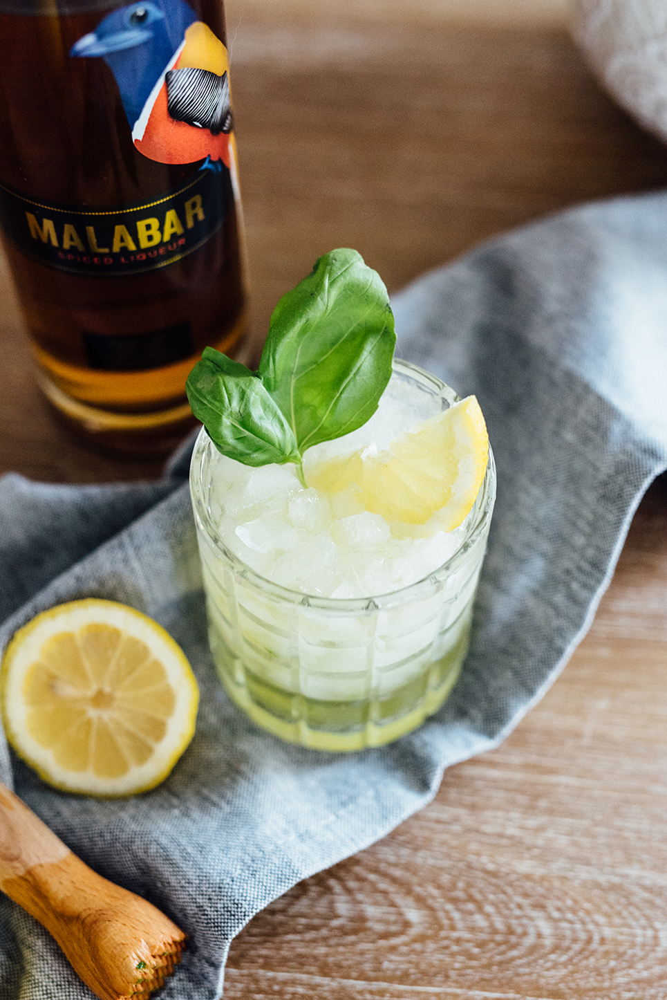 Muddle the basil, gin, and Malabar Spiced Liqueur together in a shaker and let sit for 5 minutes.